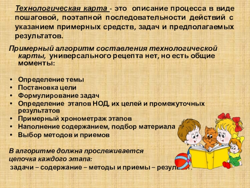 Технологическая карта - это описание процесса в виде пошаговой, поэтапной последовательности действий с указанием примерных средств, задач и предполагаемых результатов.