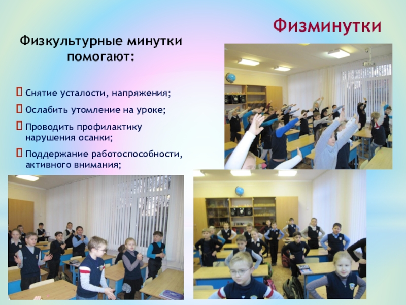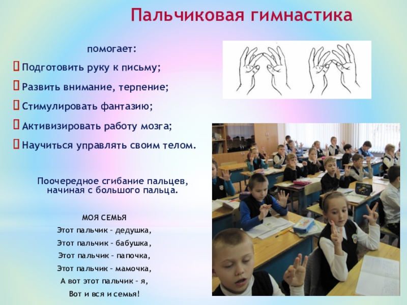 В классе радугу построим, вверх по радуге пойдём, Вправо, влево повернём, а потом скатимся вниз,