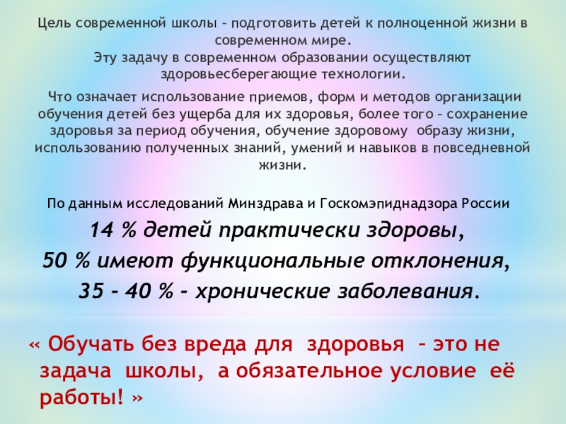 « Обучать без вреда для здоровья – это не задача школы, а обязательное условие её работы! »