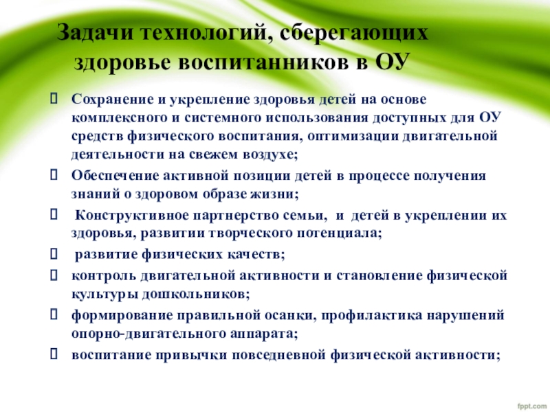 Слайд 6Задачи технологий, сберегающих здоровье воспитанников в ОУ