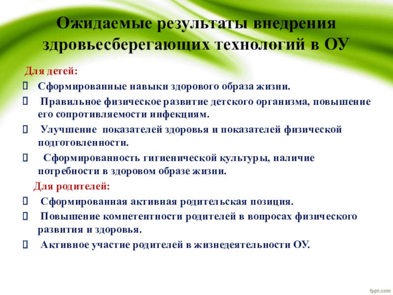 Слайд 19Ожидаемые результаты внедрения здровьесберегающих технологий в ОУ