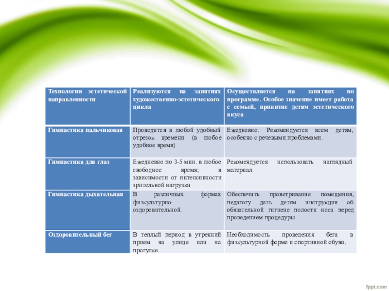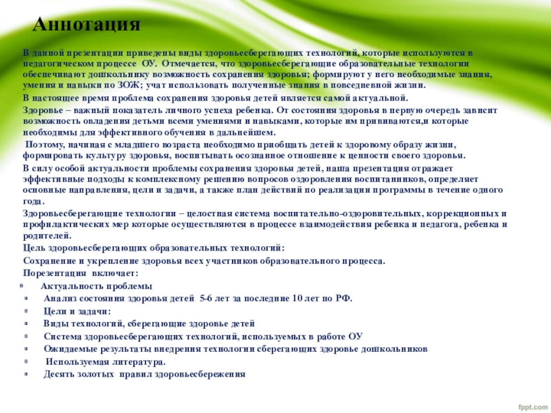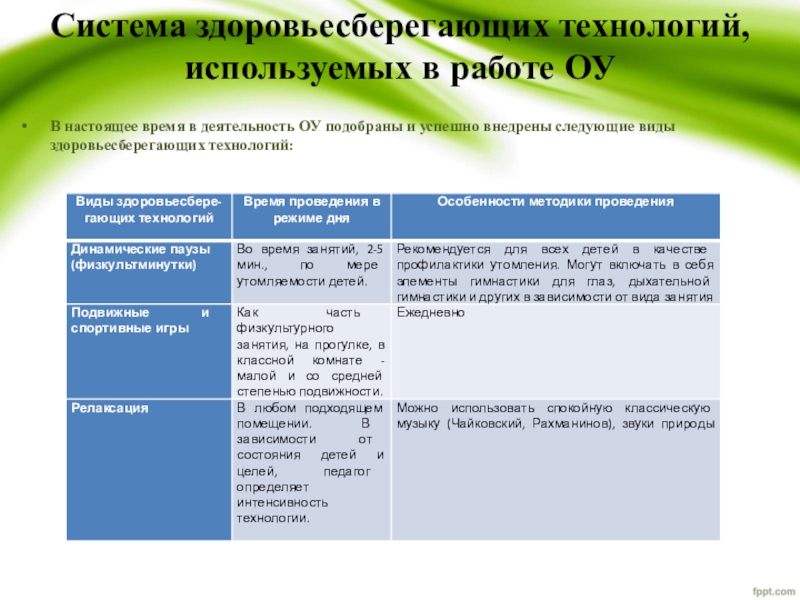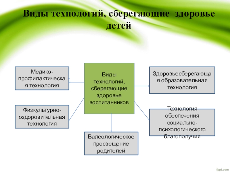 В данной презентации приведены виды здоровьесберегающих технологий, которые используются в педагогическом