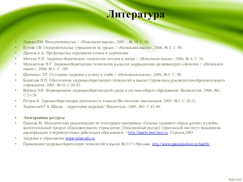 Борисова И.П. Обеспечение здоровьесберегающих технологий в школе//Справочник руководителя образовательного учреждения.-2005.-№10.-С.84-92.