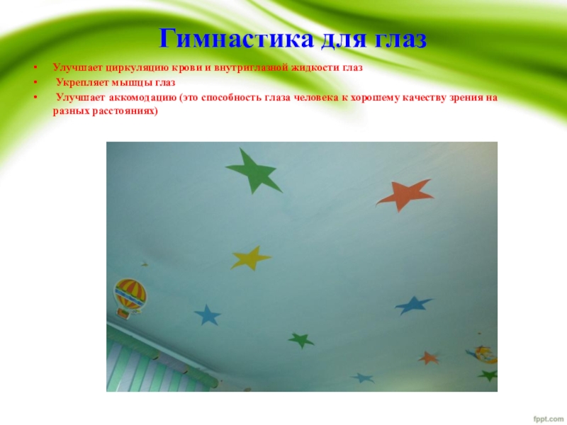 Улучшает аккомодацию (это способность глаза человека к хорошему качеству зрения на разных расстояниях)