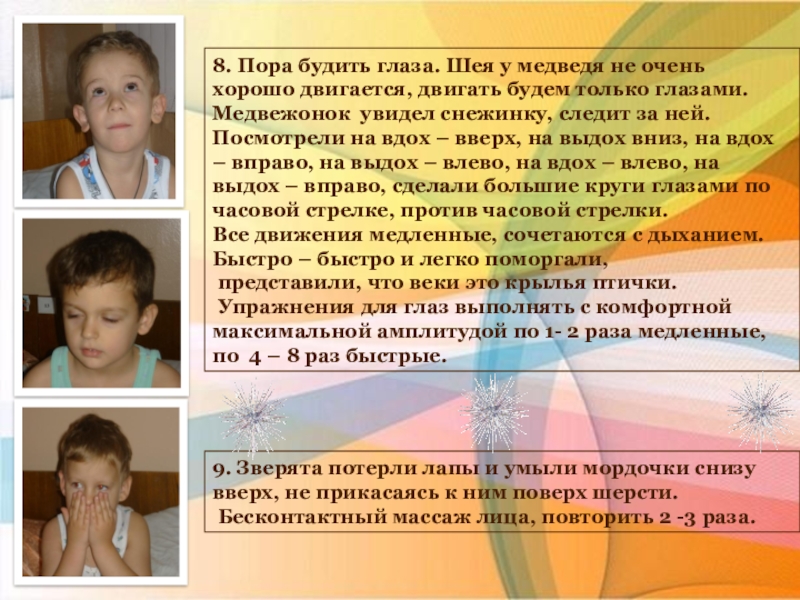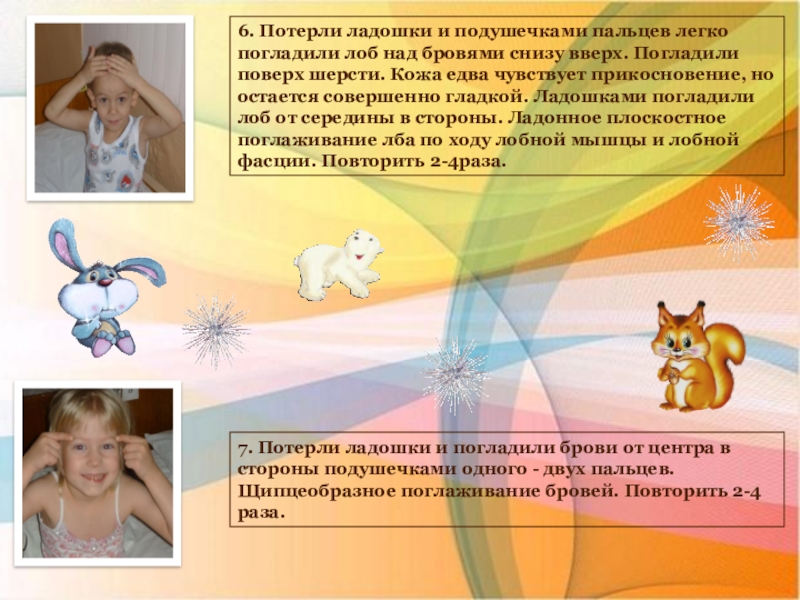 7. Потерли ладошки и погладили брови от центра в стороны подушечками одного - двух пальцев.