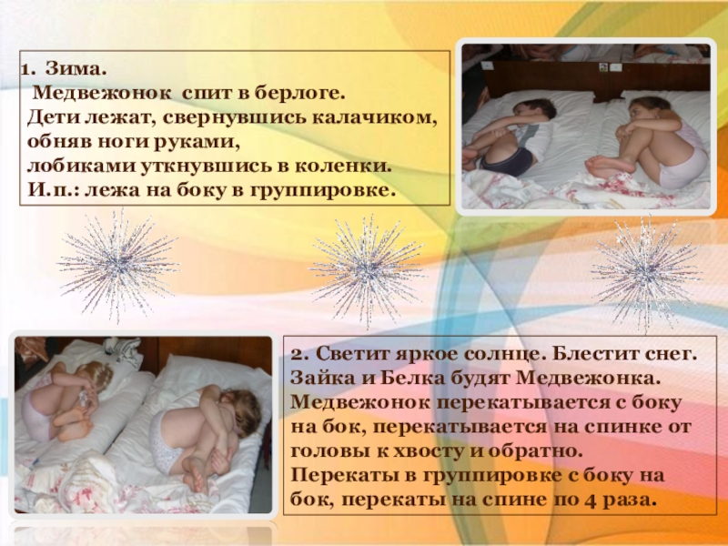 2. Светит яркое солнце. Блестит снег. Зайка и Белка будят Медвежонка.