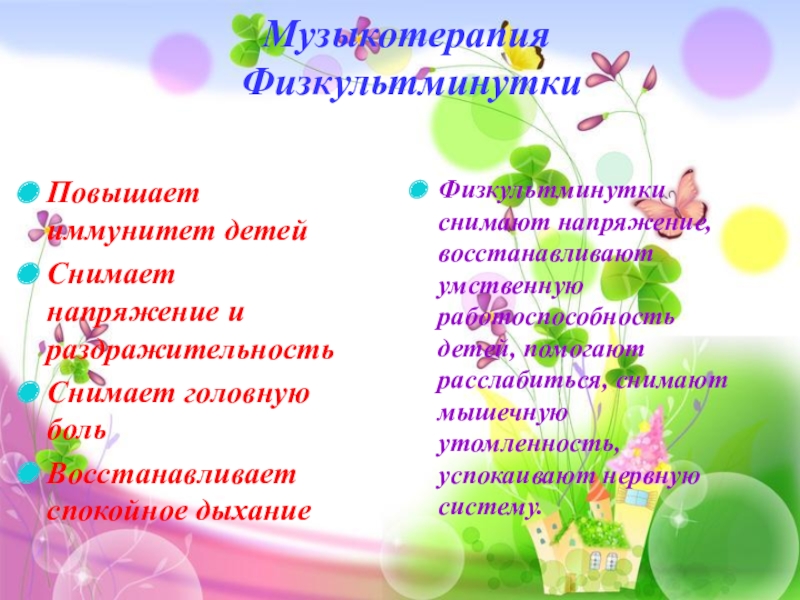 Физкультминутки снимают напряжение, восстанавливают умственную работоспособность детей, помогают расслабиться, снимают мышечную утомленность, успокаивают нервную систему.