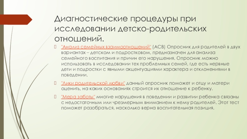 Слайд 10Диагностические процедуры при исследовании детско-родительских отношений.