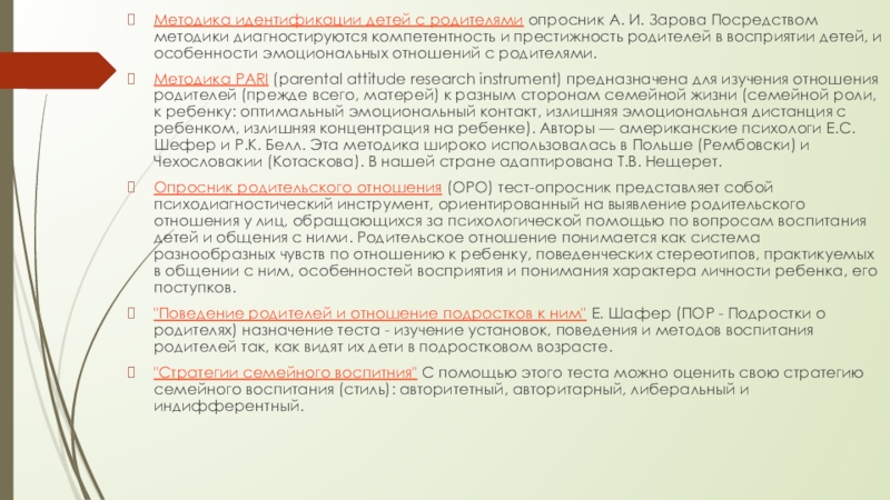 Слайд 11Методика идентификации детей с родителями опросник А. И. Зарова Посредством методики диагностируются компетентность