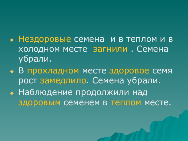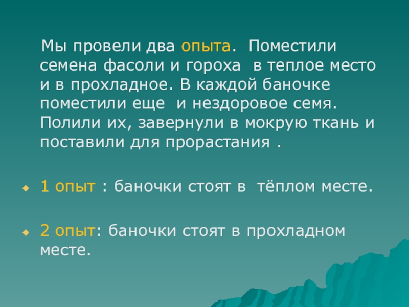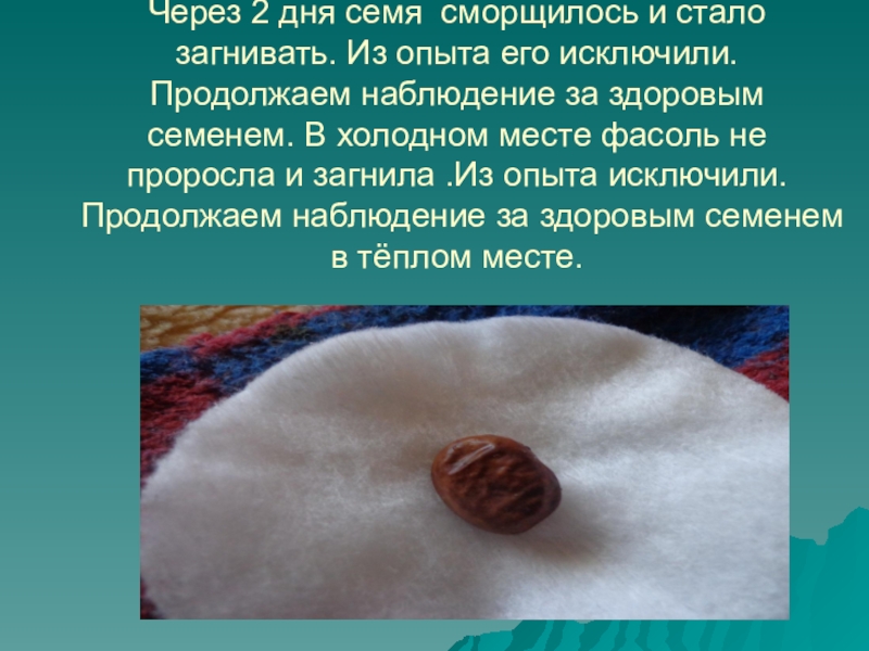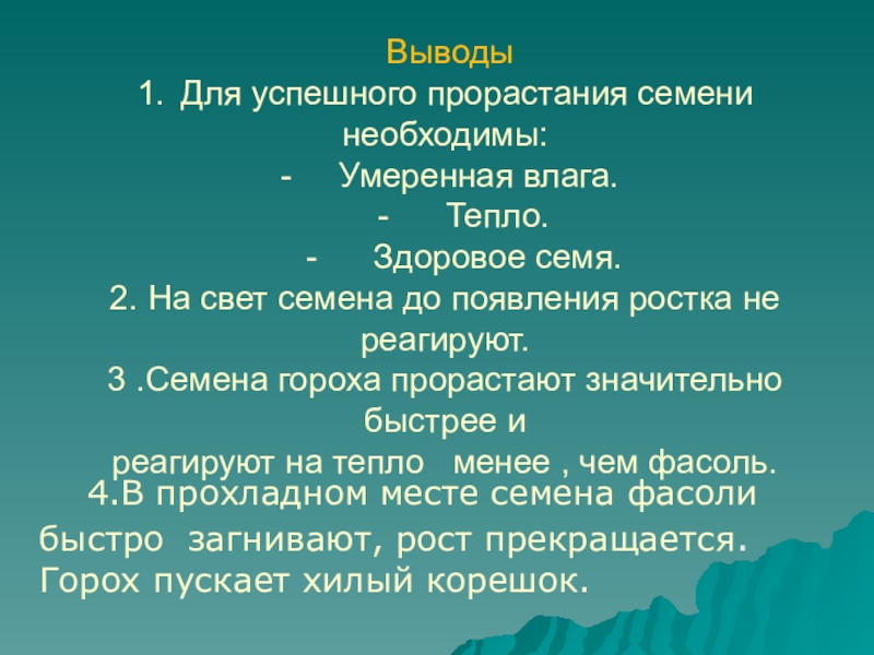 4.В прохладном месте семена фасоли быстро загнивают, рост прекращается. Горох пускает хилый корешок.