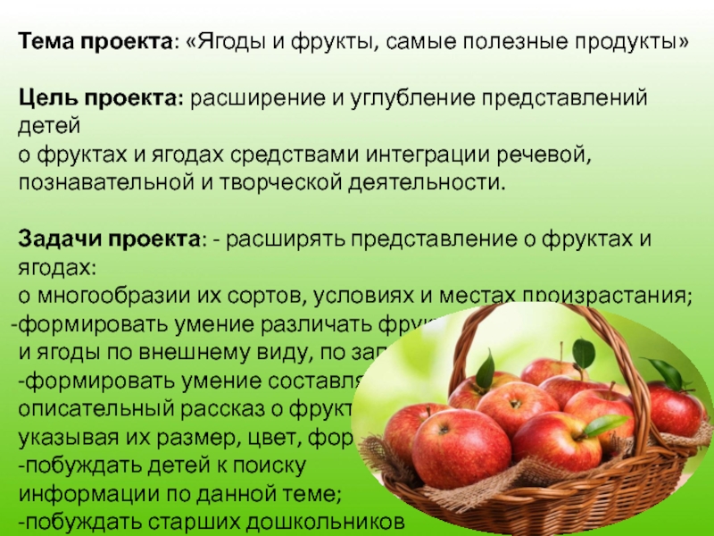 Тема проекта: «Ягоды и фрукты, самые полезные продукты»Цель проекта: расширение и углубление представлений детей о фруктах и ягодах средствами интеграции речевой,познавательной и творческой деятельности.Задачи проекта: - расширять представление о фруктах и ягодах:о многообразии их сортов, условиях