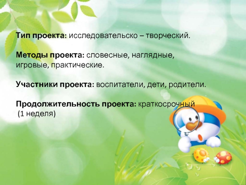 Тип проекта: исследовательско – творческий.Методы проекта: словесные, наглядные, игровые, практические.Участники проекта: воспитатели, дети, родители.Продолжительность проекта: краткосрочный (1