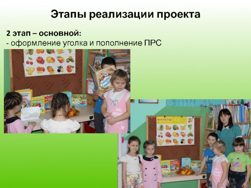 Этапы реализации проекта2 этап – основной:- оформление уголка и пополнение ПРС