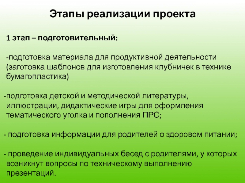 Этапы реализации проекта1 этап – подготовительный:-подготовка материала для продуктивной деятельности (заготовка шаблонов для изготовления клубничек в технике