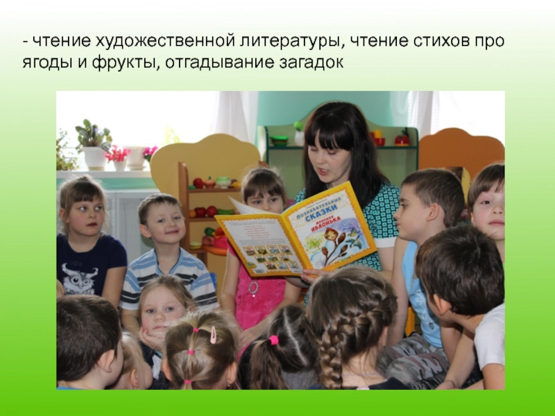 Слайд 12- чтение художественной литературы, чтение стихов про ягоды и фрукты, отгадывание