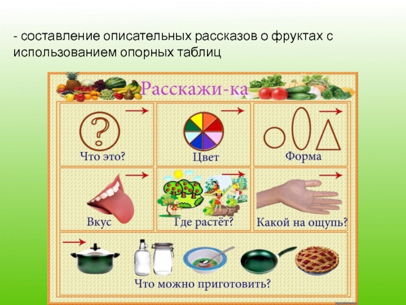 Слайд 7- составление описательных рассказов о фруктах с использованием опорных таблиц