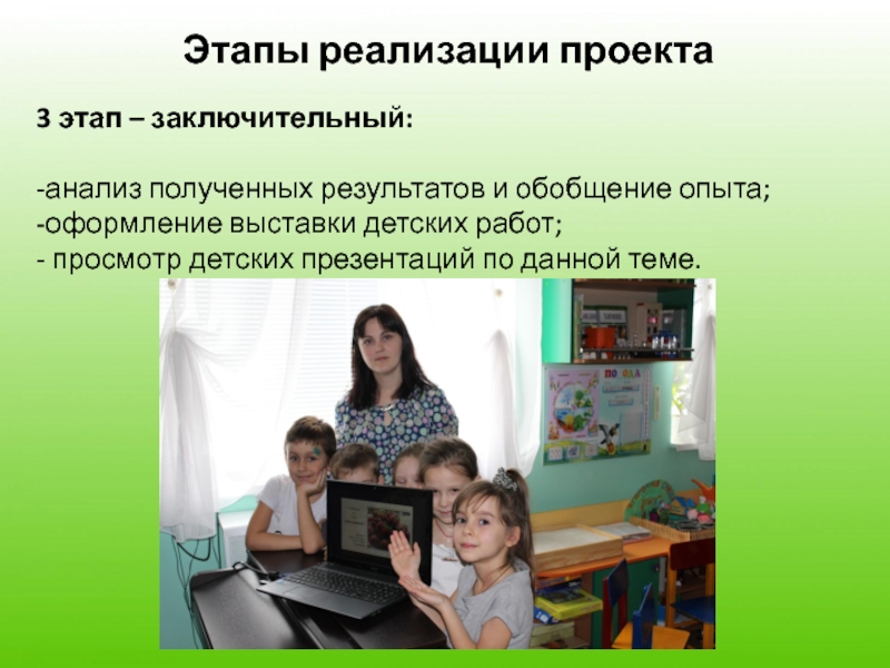 Этапы реализации проекта3 этап – заключительный:-анализ полученных результатов и обобщение опыта;-оформление выставки детских работ;- просмотр детских презентаций