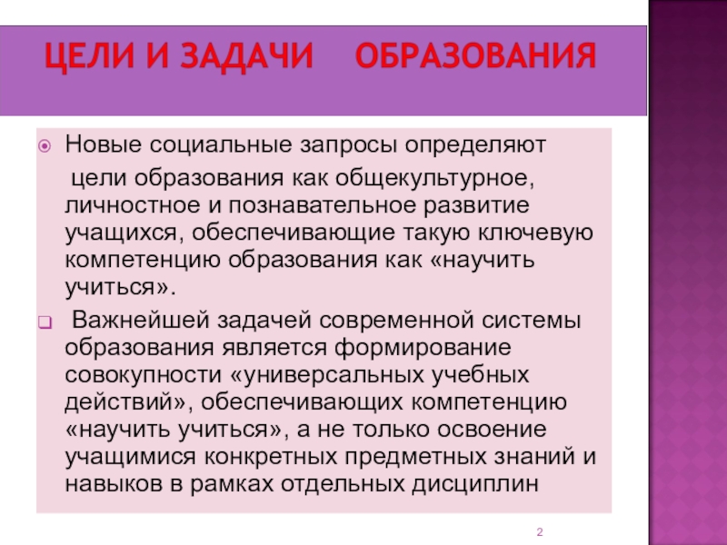 Новые социальные запросы определяют цели образования как общекультурное, личностное и познавательное развитие учащихся, обеспечивающие такую ключевую компетенцию образования как «научить учиться». Важнейшей задачей современной системы образования является формирование совокупности «универсальных учебных действий», обеспечивающих компетенцию «научить