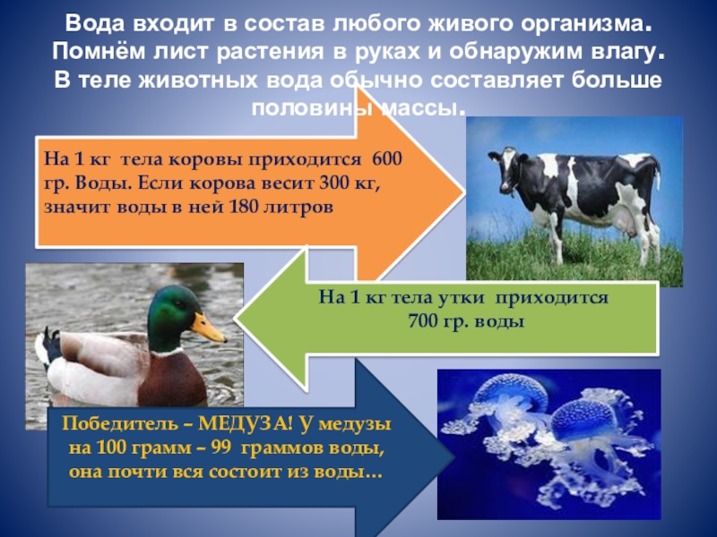 Победитель – МЕДУЗА! У медузы на 100 грамм – 99 граммов воды, она почти вся состоит из воды…