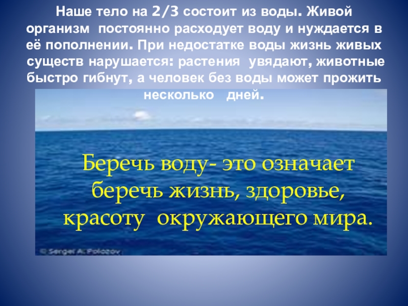 Наше тело на 2/3 состоит из воды. Живой организм постоянно расходует воду и нуждается в её пополнении. При недостатке воды жизнь живых существ нарушается: растения увядают, животные быстро гибнут, а человек без воды может прожить несколько дней.