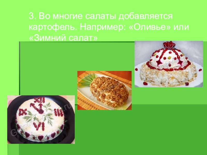 Слайд 143. Во многие салаты добавляется картофель. Например: «Оливье» или «Зимний салат»