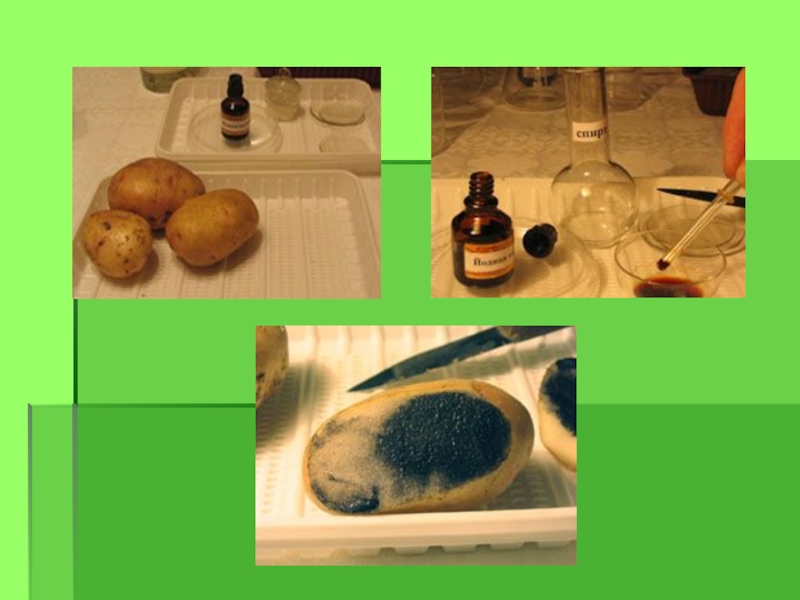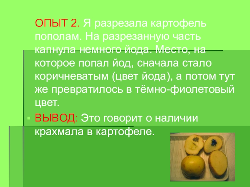 Слайд 11ОПЫТ 2. Я разрезала картофель пополам. На разрезанную часть капнула немного