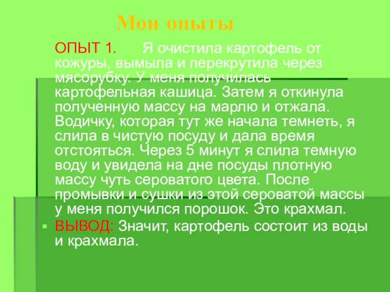 ОПЫТ 1. Я очистила картофель от кожуры, вымыла
