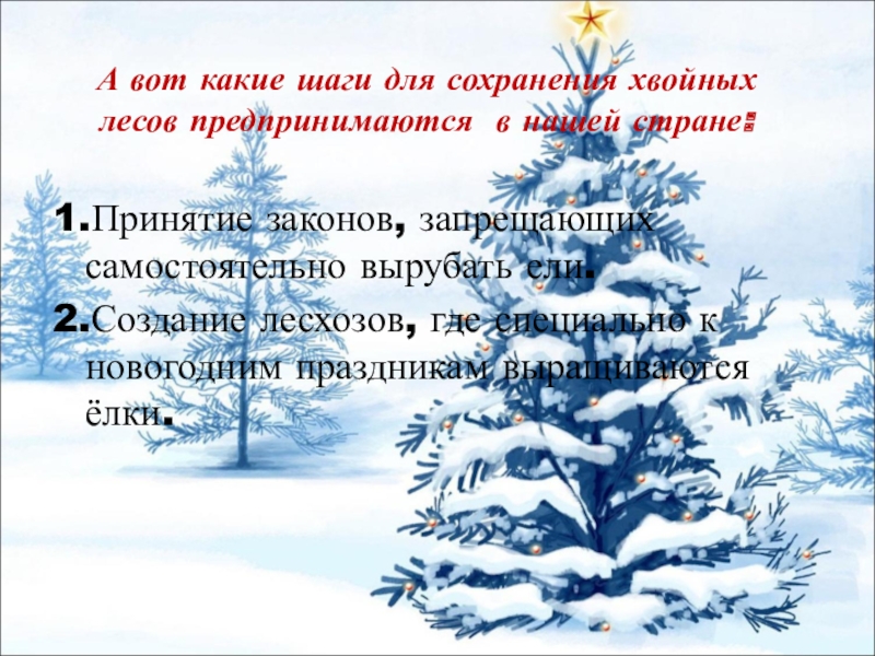 1.Принятие законов, запрещающих самостоятельно вырубать ели.