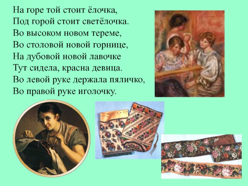 Слайд 4На горе той стоит ёлочка, Под горой стоит светёлочка. Во высоком новом тереме, Во