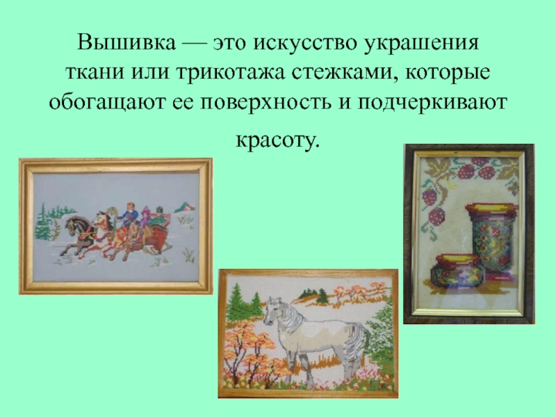 Слайд 3Вышивка — это искусство украшения ткани или трикотажа стежками, которые обогащают