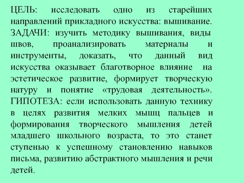 вышивания, виды швов, проанализировать материалы и инструменты, доказать, что данный вид искусства оказывает благотворное влияние на эстетическое развитие, формирует творческую натуру и понятие «трудовая деятельность». ГИПОТЕЗА: если использовать данную технику в целях развития мелких мышц пальцев и формирования творческого мышления детей младшего школьного возраста, то это станет ступенью к успешному становлению навыков письма, развитию абстрактного мышления и речи детей.
