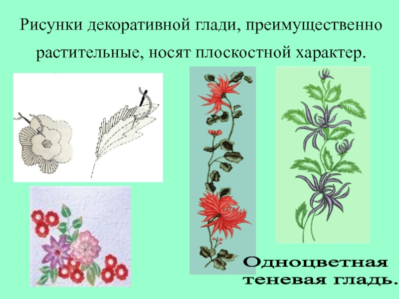 Рисунки декоративной глади, преимущественно растительные, носят плоскостной характер. Одноцветная  теневая гладь.