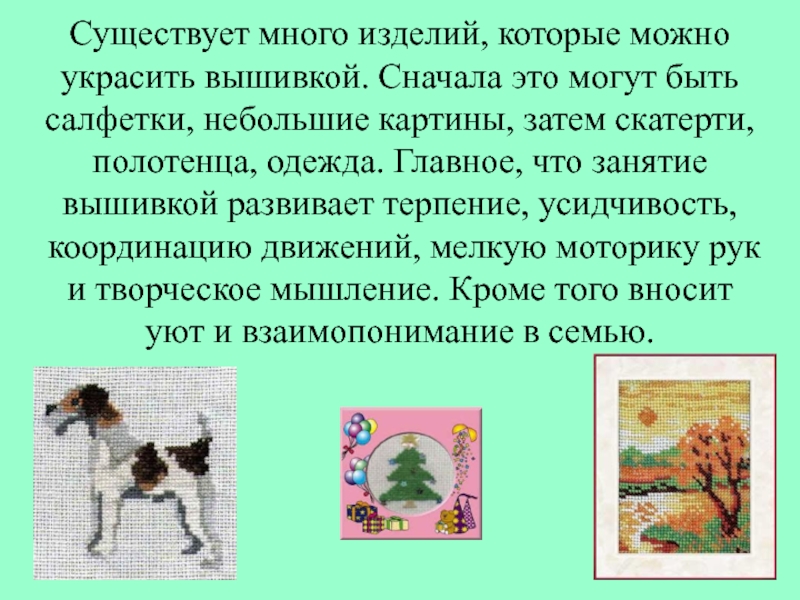 салфетки, небольшие картины, затем скатерти, полотенца, одежда. Главное, что занятие вышивкой развивает терпение, усидчивость, координацию движений, мелкую моторику рук и творческое мышление. Кроме того вносит уют и взаимопонимание в семью.