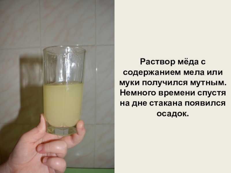 Раствор мёда с содержанием мела или муки получился мутным. Немного времени