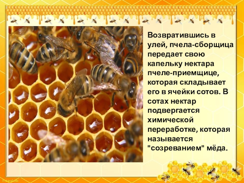 его в ячейки сотов. В сотах нектар подвергается химической переработке, которая называется "созреванием" мёда.