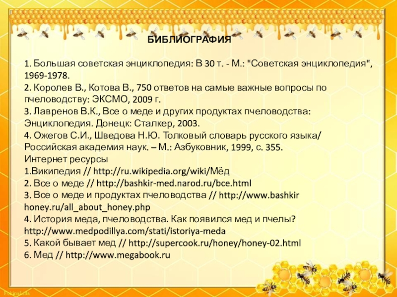 1.Википедия // http://ru.wikipedia.org/wiki/Мёд