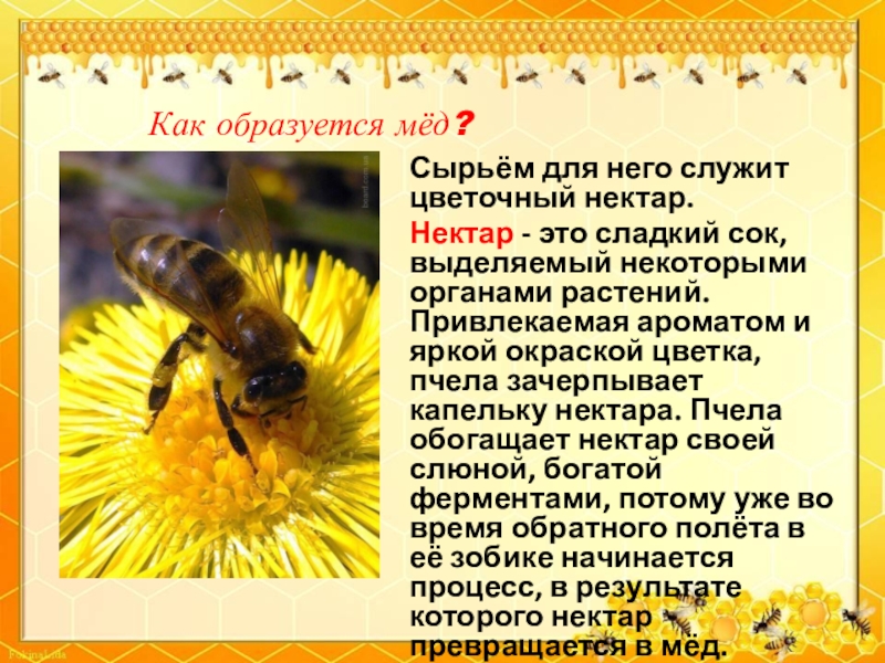 сладкий сок, выделяемый некоторыми органами растений. Привлекаемая ароматом и яркой окраской цветка, пчела зачерпывает капельку нектара. Пчела обогащает нектар своей слюной, богатой ферментами, потому уже во время обратного полёта в её зобике начинается процесс, в результате которого нектар превращается в мёд.