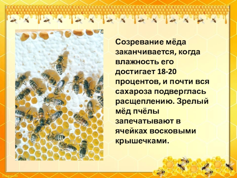 Слайд 10Созревание мёда заканчивается, когда влажность его достигает 18-20 процентов, и почти