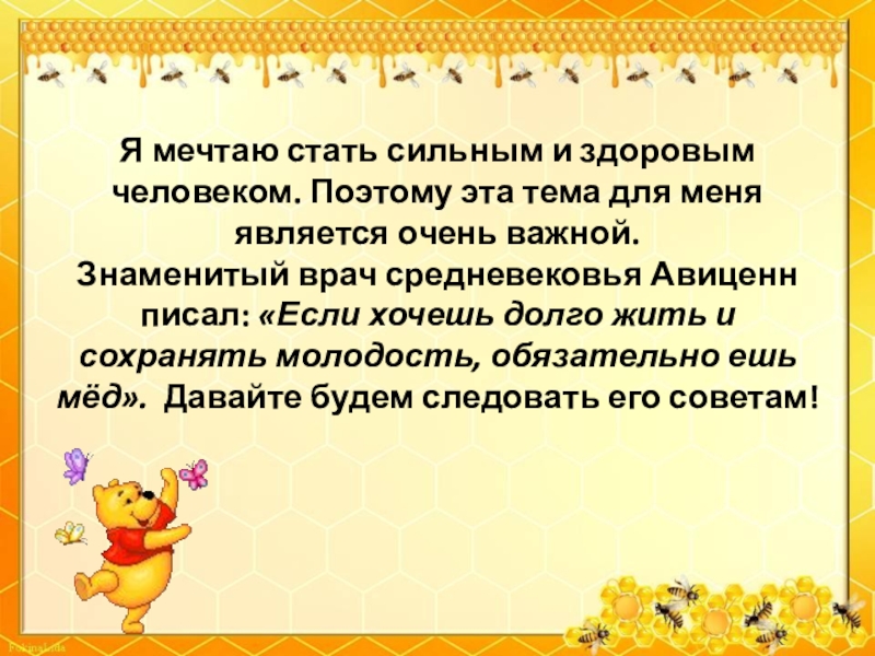 Знаменитый врач средневековья Авиценн писал: «Если хочешь долго жить и сохранять молодость, обязательно ешь мёд». Давайте будем следовать его советам!