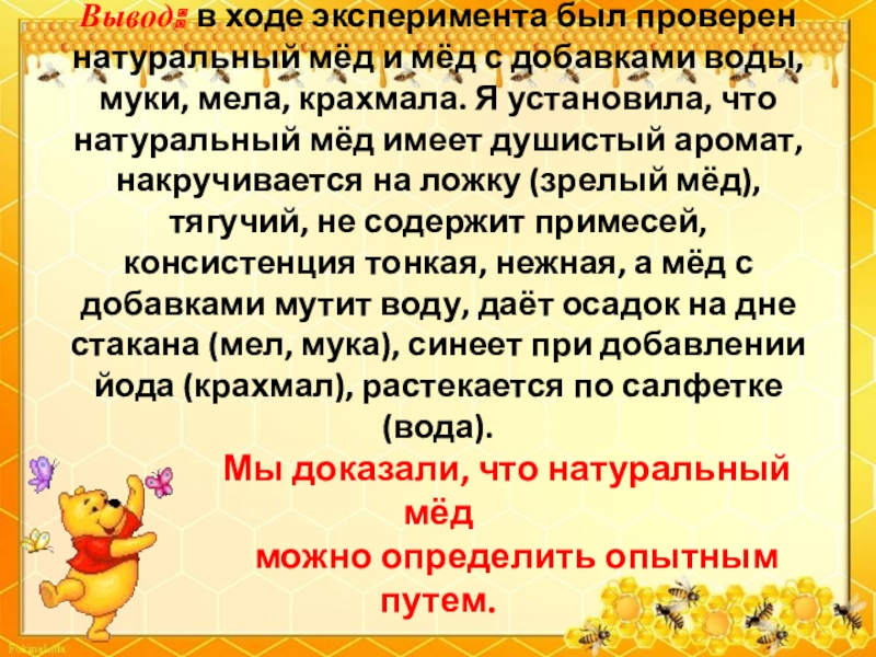 Слайд 38Вывод: в ходе эксперимента был проверен натуральный мёд и мёд с