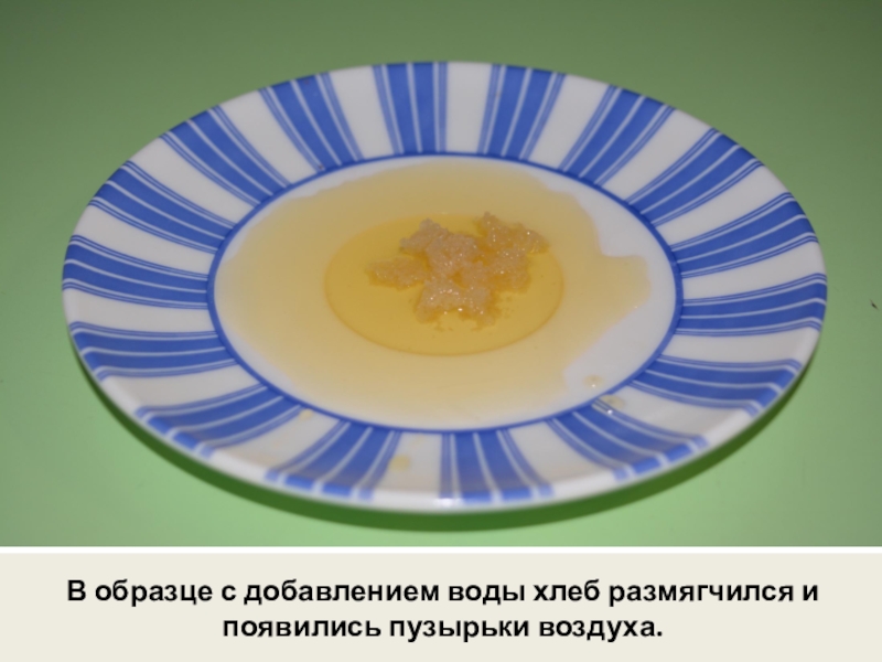 Слайд 24В образце с добавлением воды хлеб размягчился и появились пузырьки воздуха.