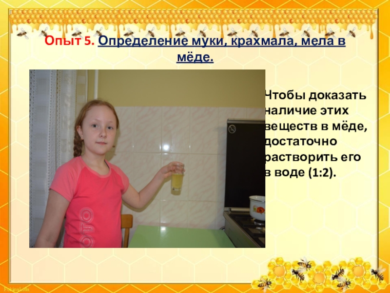 Слайд 29Опыт 5. Определение муки, крахмала, мела в мёде.