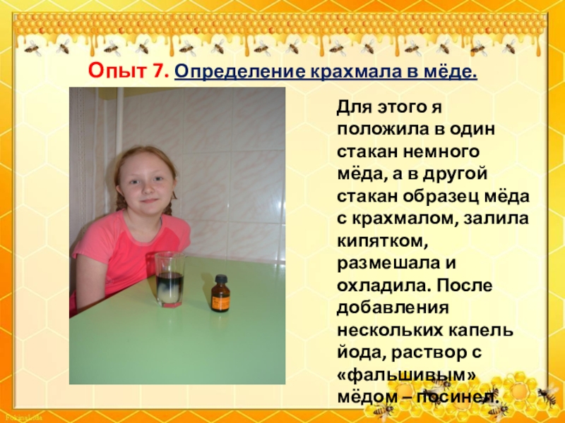 Слайд 34Опыт 7. Определение крахмала в мёде.