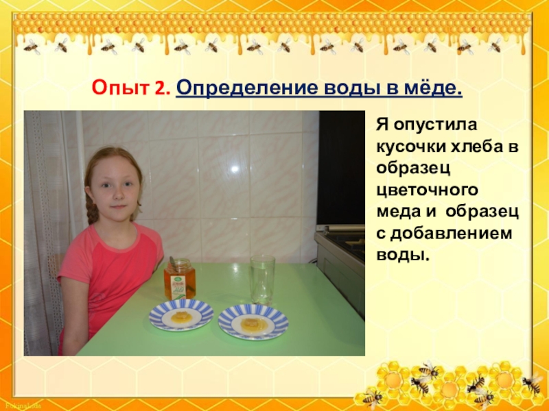Слайд 25Опыт 3. Определение воды и сахара в мёде.