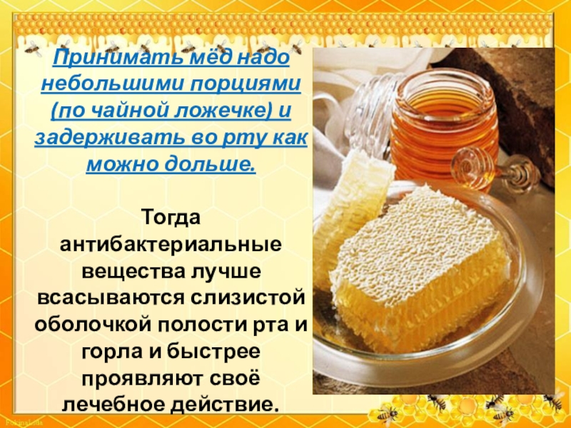 Слайд 17Принимать мёд надо небольшими порциями