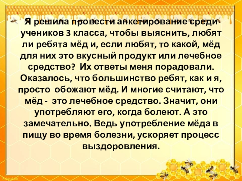 ли ребята мёд и, если любят, то какой, мёд для них это вкусный продукт или лечебное средство? Их ответы меня порадовали. Оказалось, что большинство ребят, как и я, просто обожают мёд. И многие считают, что мёд - это лечебное средство. Значит, они употребляют его, когда болеют. А это замечательно. Ведь употребление мёда в пищу во время болезни, ускоряет процесс выздоровления.