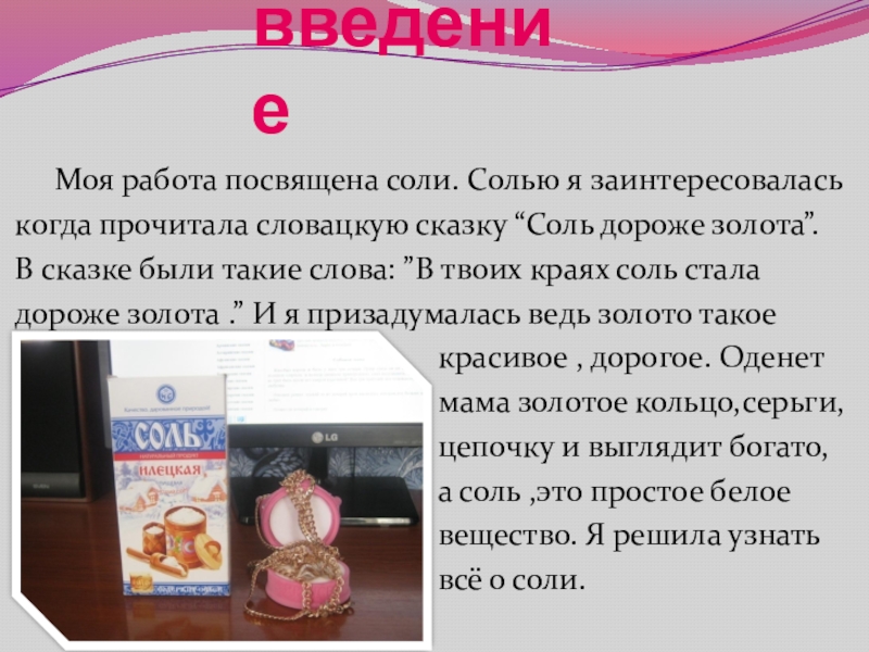 введение Моя работа посвящена соли. Солью я заинтересоваласькогда прочитала словацкую сказку “Соль дороже золота”.В сказке были такие слова: ”В твоих краях соль стала дороже золота .” И я призадумалась ведь золото такое