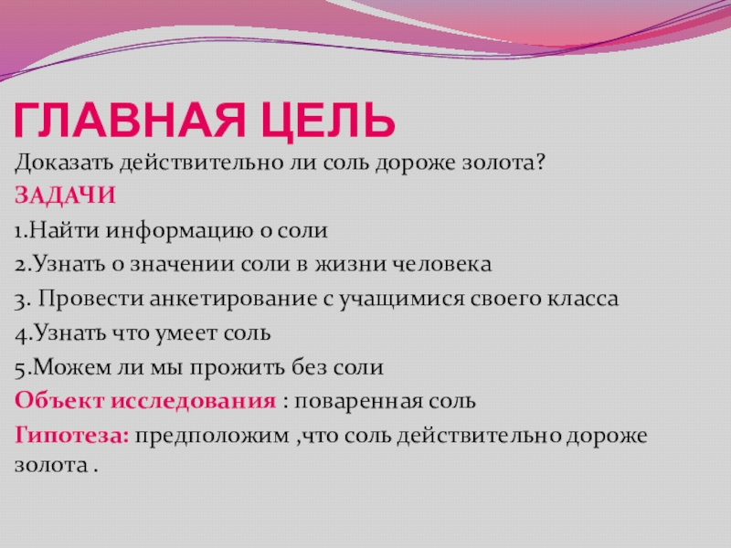 ГЛАВНАЯ ЦЕЛЬ Доказать действительно ли соль дороже золота?ЗАДАЧИ1.Найти информацию о соли2.Узнать о значении соли в жизни человека3.
