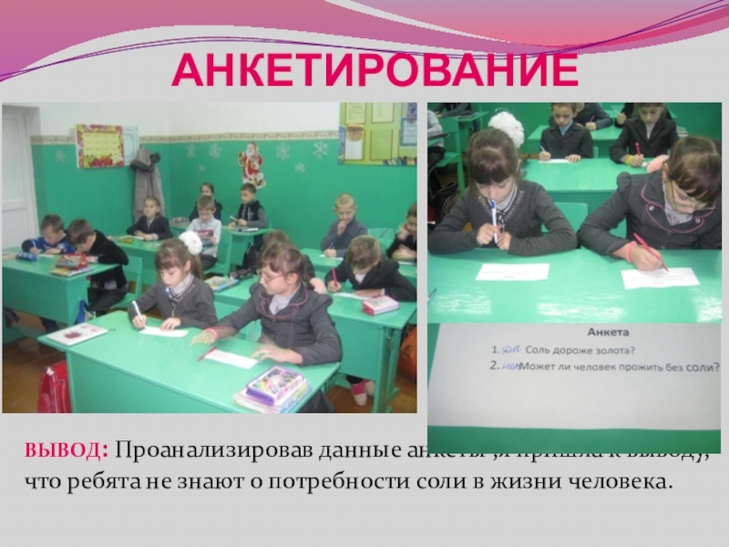 АНКЕТИРОВАНИЕВЫВОД: Проанализировав данные анкеты ,я пришла к выводу,что ребята не знают о потребности соли в жизни человека.