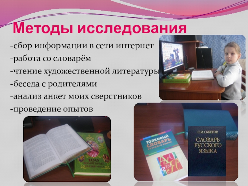 Методы исследования-сбор информации в сети интернет-работа со словарём-чтение художественной литературы-беседа с родителями-анализ анкет моих сверстников-проведение опытов